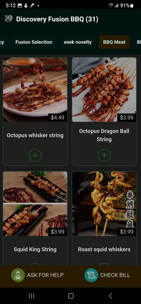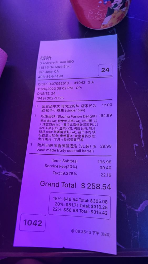 Introducing the menu at Discovery Fusion BBQ: A Chinese fusion barbeque hotspot located in San Jose, CA. Offering a plethora of BBQ meat and veggie options, from Mini Lamb Skewers to BBQ Corn Kernel Bunch. Catering to the adventurous, they serve unique dishes like Grilled Lamb Testicles and Salt and Pepper Silkworm Chrysalis. Customers rave about the lively ambiance, live karaoke, and creative drink options. With a focus on sustainability, the restaurant provides plastic-free packaging and reusable tableware. Standout dishes include the BBQ Chicken Wing, Iron Plate Squid, and Yellow Croaker Cold Salad. Service is attentive, and the ordering process is convenient through QR code technology. Come for a fun and delicious dining experience with friends and family at Discovery Fusion BBQ.